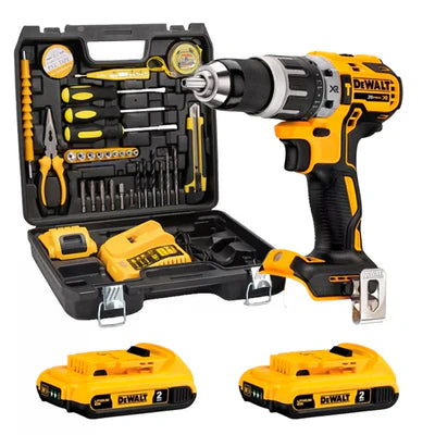 El paquete incluye el taladro inalámbrico, dos baterías potentes, y una variedad de accesorios para diversas aplicaciones de perforación y atornillado.
