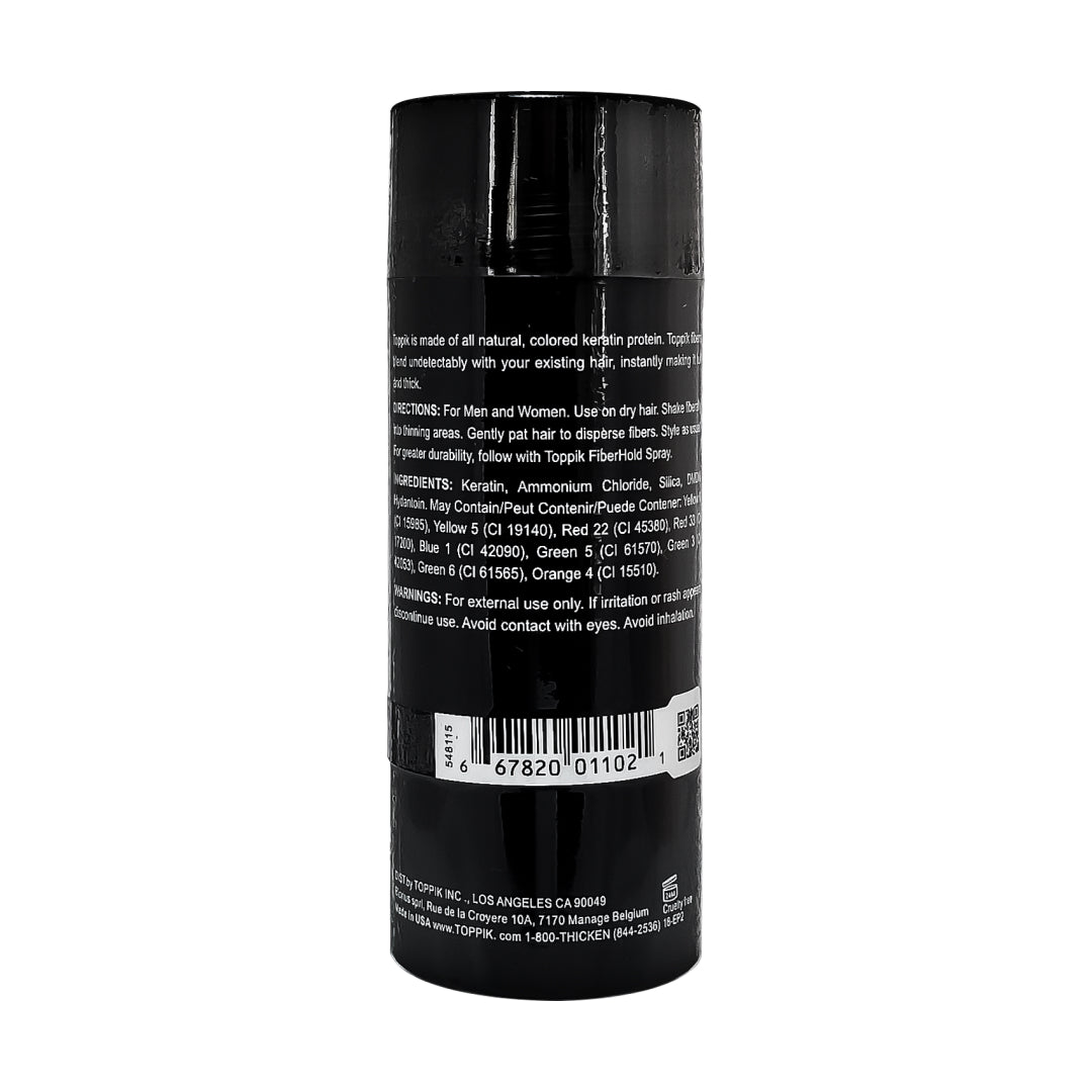 No se pudo cargar la disponibilidad de retiro Densidad y volumen para tu cabello al instante. Toppik es especialista y líder mundial en soluciones cosméticas para cabellos finos y escasos, así como para personas con problemas de caída de cabello. Toppik es un maquillaje capilar compuesto por fibras de keratina que se adhieren al cabello de manera natural para conseguir mayor volumen. Densidad y volumen para tu cabello al instante. Toppik es un maquillaje capilar en forma de microfibras de keratina orgánica, componente natural del cabello. Se aplica a las zonas donde el cabello es escaso o fino para conseguir un aspecto voluminoso natural al instante. Puede ser usado tanto en hombres como en mujeres. Toppik is indetectable, incluso de cerca. Las fibras de keratina se enlazan con el cabello perfectamente y se mantienen firmemente hasta el próximo lavado, eliminándose fácilmente con cualquier champú. Toppik utiliza keratina de la más alta calidad derivada de una fuente natural de lana, lo más idéntico al cabello humano. La keratina de Toppik tiene una carga electrostática innata que posibilita la adherencia con el cabello humano. Además, las proteínas de la keratina de Toppik tienen una proporción óptima del aminoácido cisteína. La cisteína contiene átomos de sulfuro, los cuales tienen tendencia a formar puentes de disulfuro (uniones naturales entre dos sulfuros). De esta manera también, Toppik se enlaza naturalmente con la fibra natural del cabello. Toppik está hecho de la proteina keratina, que es de lo que está hecho el cabello humano. La keratina de Toppik proviene de lana, que es la keratina más semejante al cabello humano. Toppik permanence en el cabello con viento, lluvia y transpiración. Para máximos resultados utilice una laca de fijación para el cabello. Toppik no impulsa ni inhibe el crecimiento del cabello. Las fibras naturales de keratina no pueden tapar poros ni afectar a la condición del cuero cabelludo. Las fibras permanecen hasta el próximo lavado de cabello. Pueden moverse un poco dentro de esa semana pero se pueden retocar fácilmente. Muchas personas van a la peluquería cada semana para un lavado y peinado y dejan permanecer las fibras hasta su próxima cita. Toppik no es un tinte, pero es una manera cosmética sencilla para cubrir las canas y raíces y para prolongar la vida del tinte.